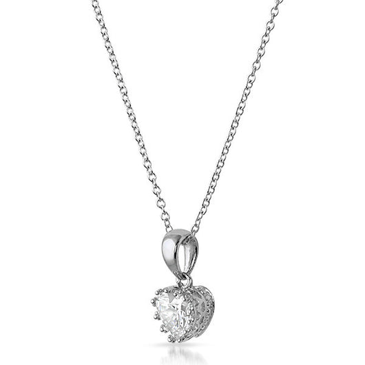 This simple yet elegant necklace features a unique heart cut 1 carat solitaire set in a highly detailed crown setting. This beauty works well as an everyday necklace but would serve as a nice addition to an evening look as well. This beautiful necklace is hand made out of fine sterling silver with attention to detail. It has been finished in rhodium just like white gold jewelry for a lustrous and rich look. It is virtually identical to white gold and diamond jewelry. The necklace is adjustable from 16-18 inches in length.