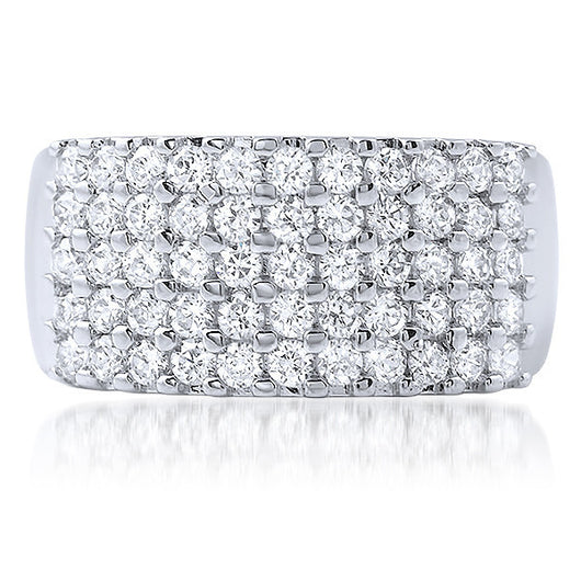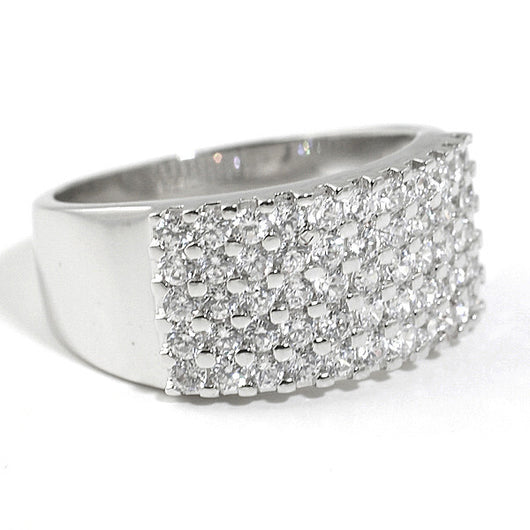 This ring has 55 small sized stones for a nice "believable" sparkle. The versatile look can be worn casually or formally and the wide shank provides comfort and durability. Order yours today! This beautiful ring gives you the same look of white gold and diamonds at a fraction of the cost. The stones are 5A flawless zirconia, which sparkle with incredible fire and brilliance. They are all individually hand set by experienced master jewelers. The ring is made out of genuine 925 sterling silver. Just like white gold jewelry, the metal has a lustrous rhodium top layer which protects it from tarnish.